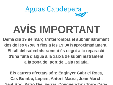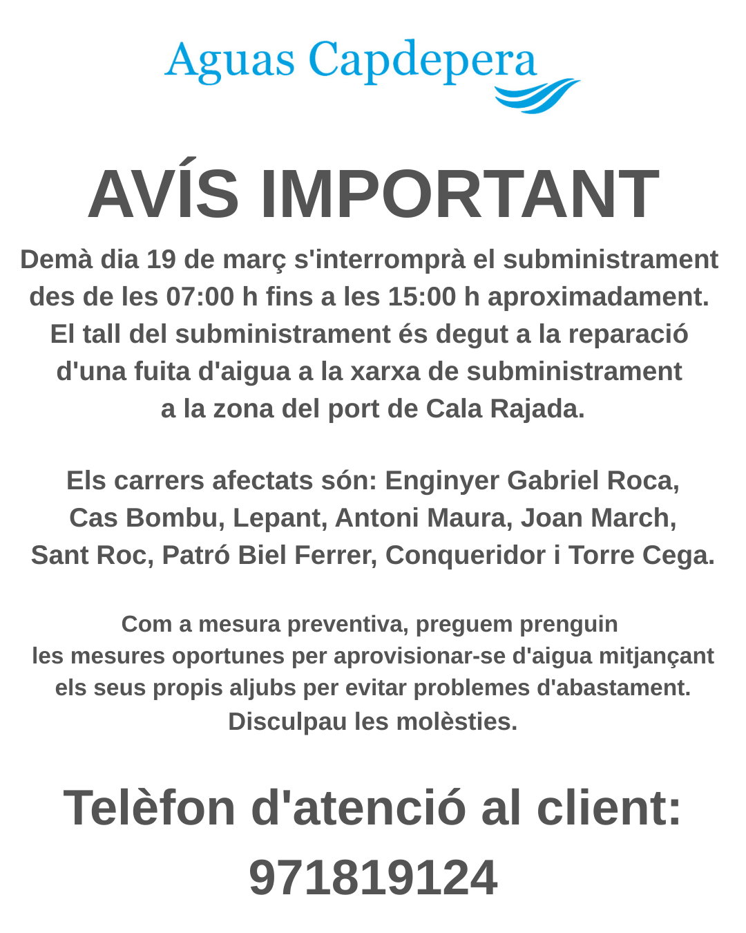 Demà dia 19 de març s'interromprà el subministrament des de les 07:00 h fins a les 15:00 h aproximadament. El tall del subministrament és degut a la reparació d'una fuita d'aigua a la xarxa de subministrament a la zona del port de Cala Rajada.