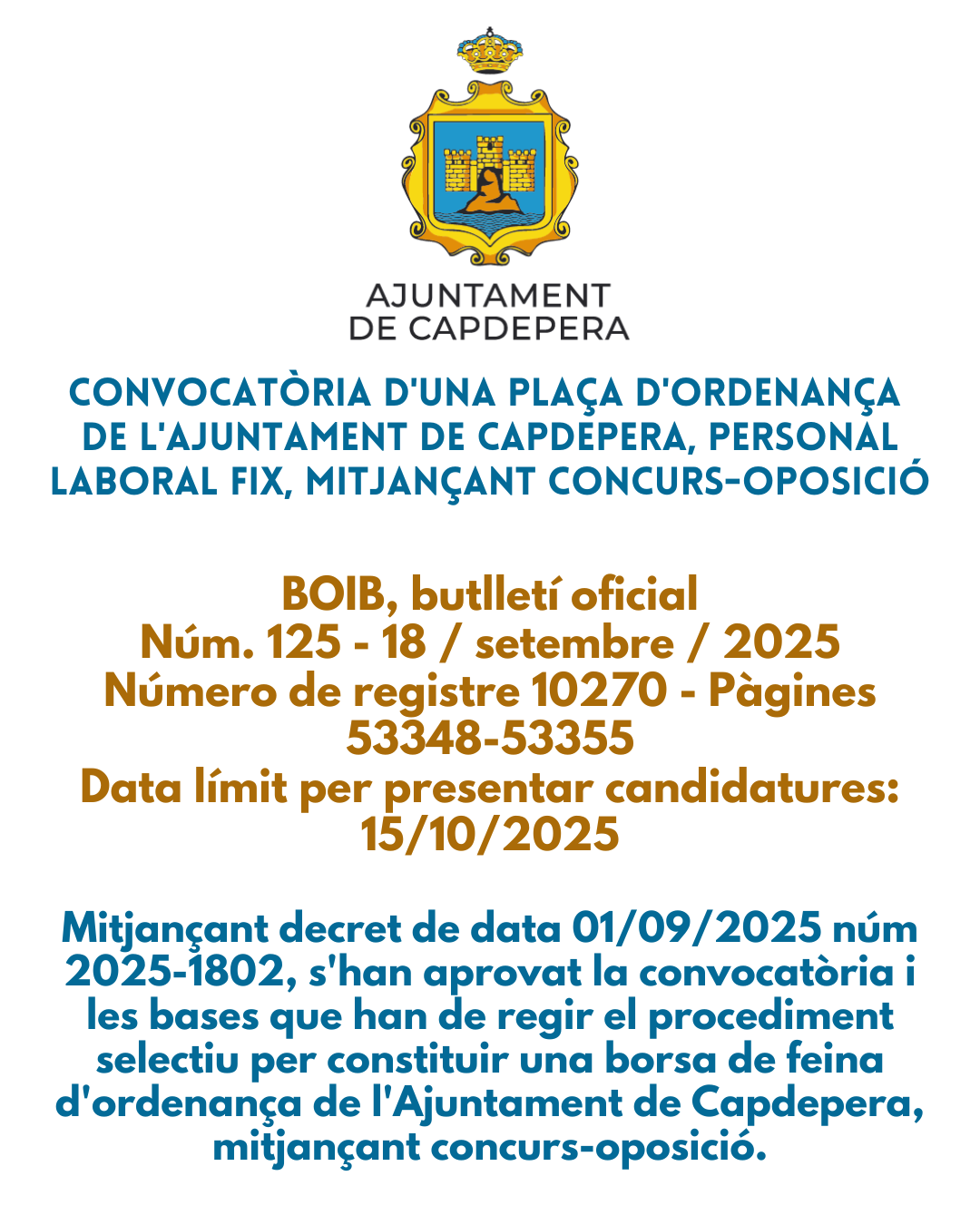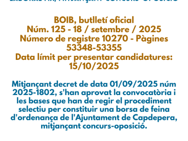 Mitjançant decret de data 01/09/2025 núm 2025-1802, s'han aprovat la convocatòria i les bases que han de regir el procediment selectiu per constituir una borsa de feina d'ordenança de l'Ajuntament de Capdepera, mitjançant concurs-oposició.
