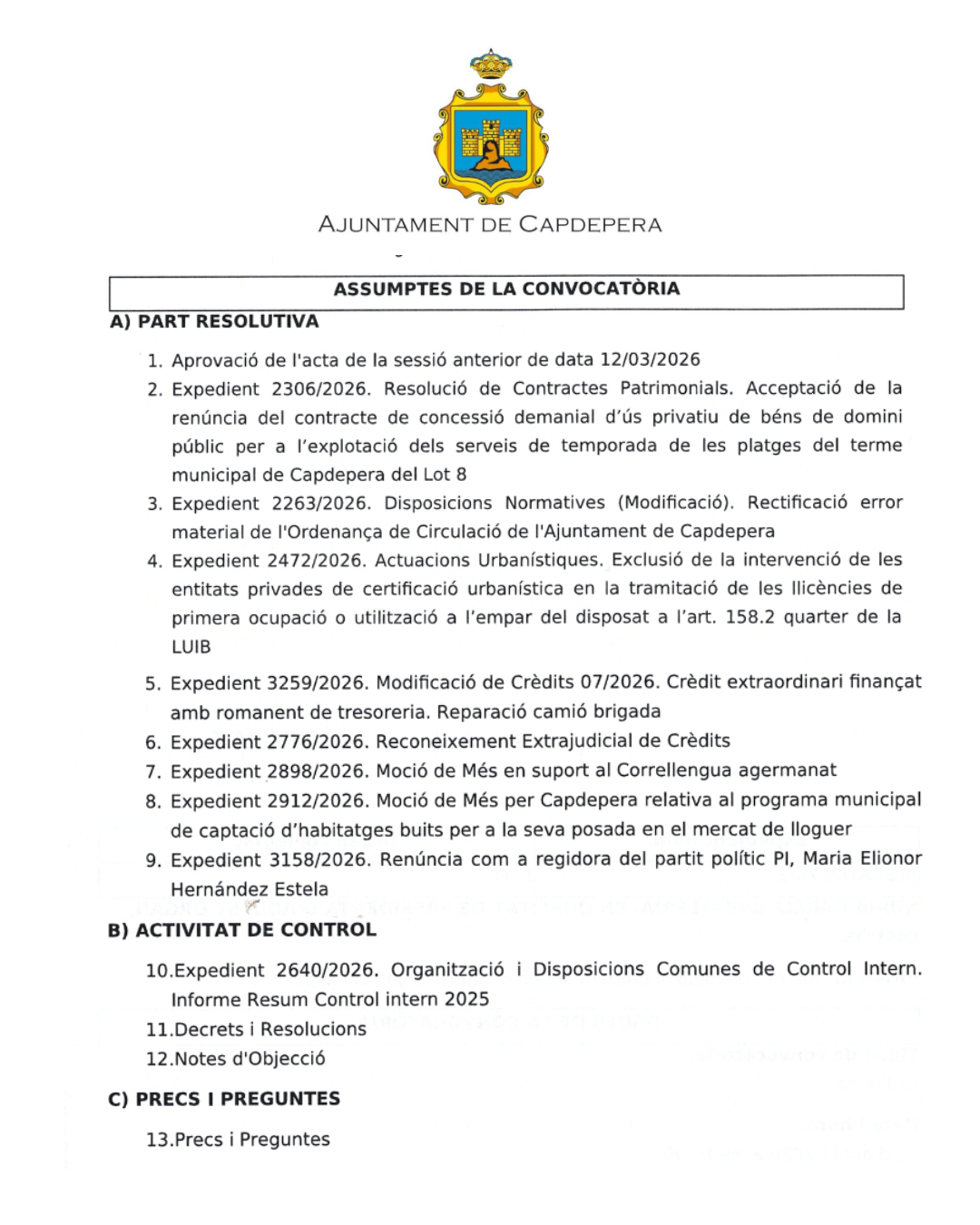 Dijous 9 d'abril a les 19.00 h.Sala plens - Ajuntament de Capdepera (no admet participació a distància)