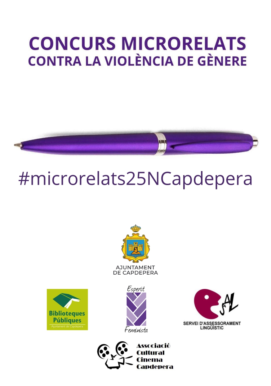 L'Ajuntament de Capdepera i Esperit Feminista han convocat, per segon any consecutiu, el Concurs de Microrelats contra la Violència de Gènere, amb la col·laboració de les Biblioteques Municipals de Capdepera, el Servei d'Assessorament Lingüístic i Esperit Feminista i també de l'Associació Cultural Cinema de Capdepera i l'estanc Can Pep Serra.