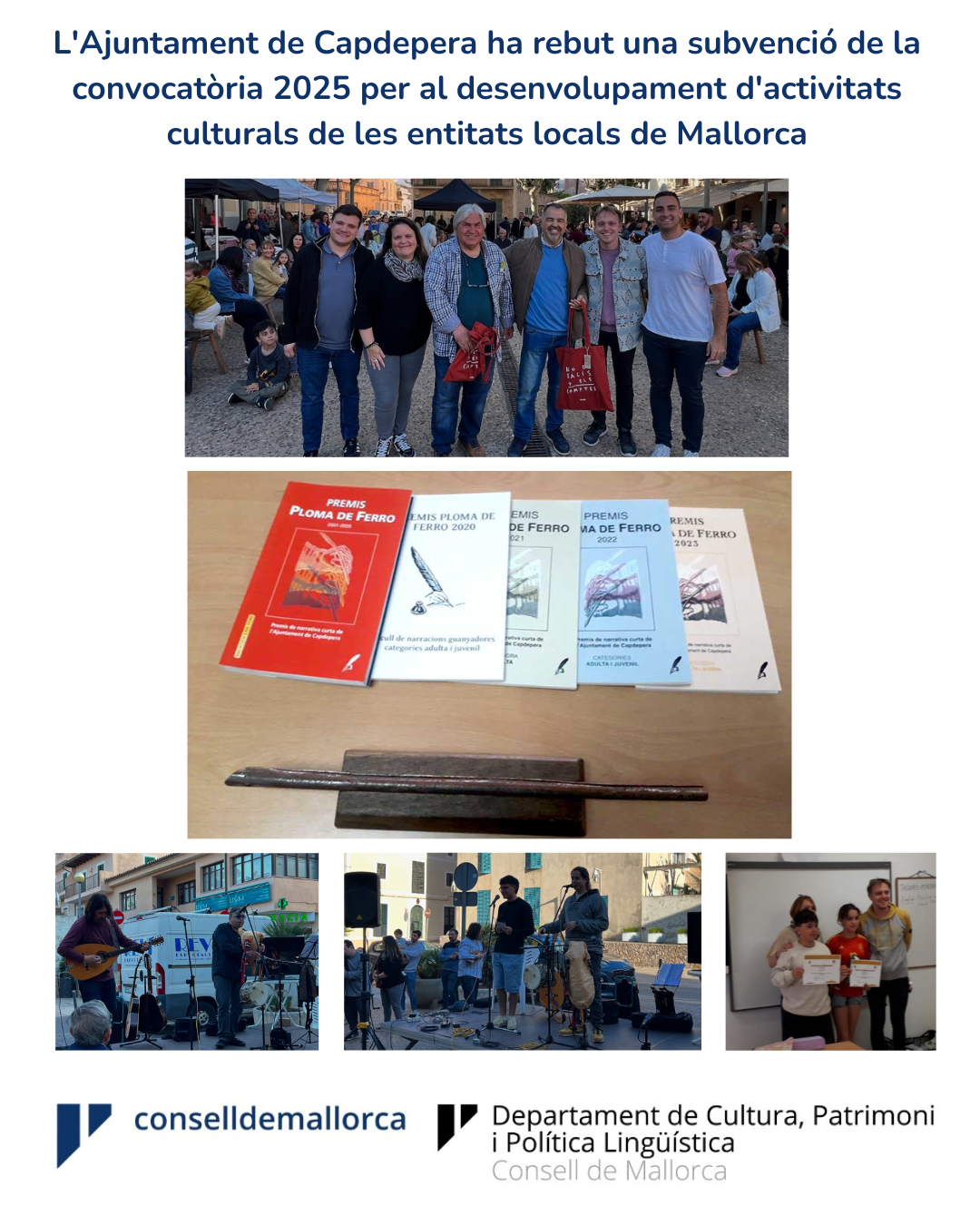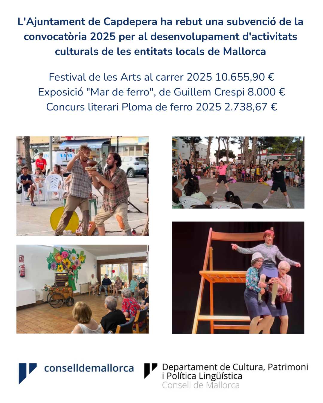 Segons la resolució de concessió de la convocatòria de subvencions 2025 per al desenvolupament d'activitats culturals de les entitats locals de Mallorca, l'Ajuntament de Capdepera ha rebut una subvenció del Consell de Mallorca de 21.394,57 € pel desenvolupament dels projectes següents: