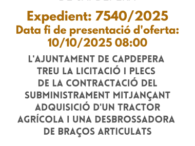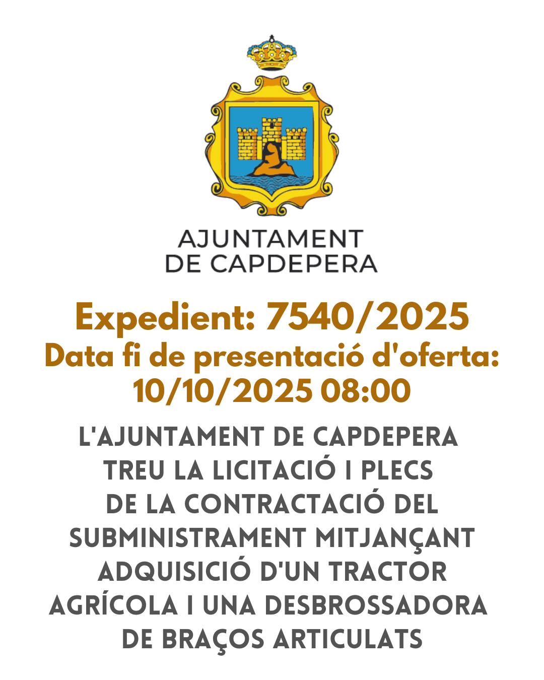 L'Ajuntament de Capdepera treu la licitació i plecs de la contractació del subministrament mitjançant adquisició d'un tractor agrícola i una desbrossadora de braços articulats