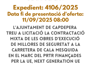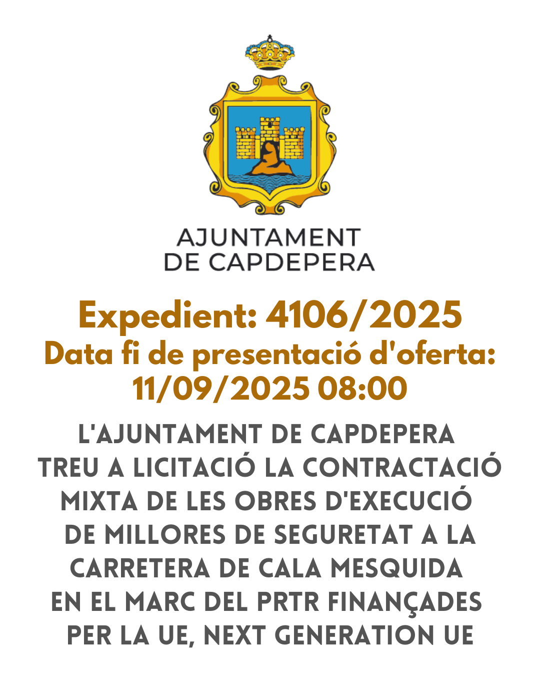 L'Ajuntament de Capdepera treu a licitació la contractació mixta de les obres d'execució de millores de seguretat a la carretera de Cala Mesquida en el marc del PRTR finançades per la UE, Next Generation UE