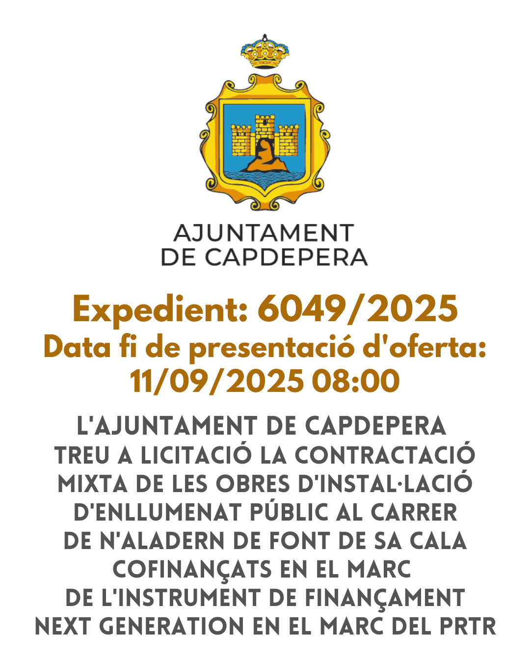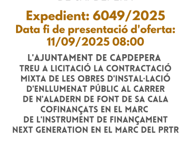 L'Ajuntament de Capdepera treu a licitació la contractació mixta de les obres d'Instal·lació d'Enllumenat Públic al c/de n'Aladern de Font de Sa Cala cofinançats en el marc de l'instrument de finançament Next Generation en el marc del PRTR