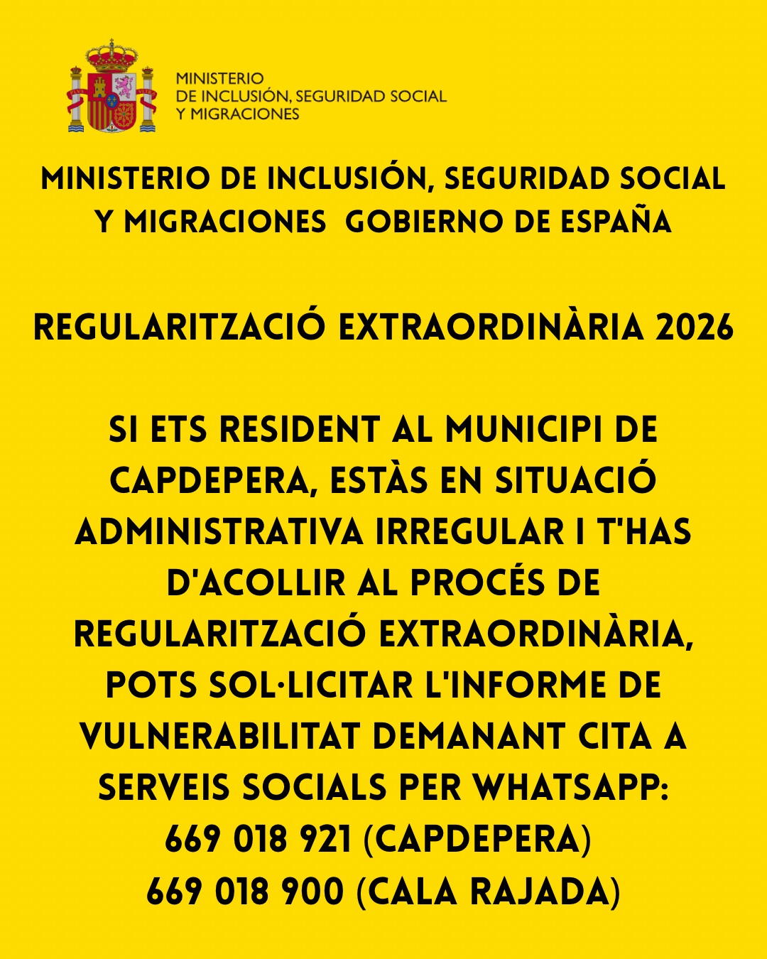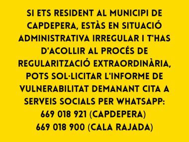 Si ets resident al municipi de Capdepera, estàs en situació administrativa irregular i t'has d'acollir al procés de regularització extraordinària, pots sol·licitar l'informe de vulnerabilitat demanant cita a Serveis Socials per WhatsApp: 669 018 921 (Capdepera) o 669 018 900 (Cala Rajada).