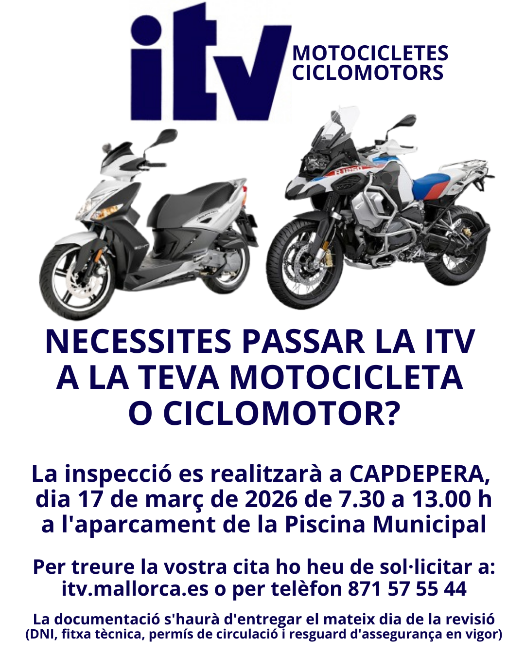 Per treure la vostra cita ho heu de sol·licitar a: itv.mallorca.es o per telèfon 871 57 55 44.