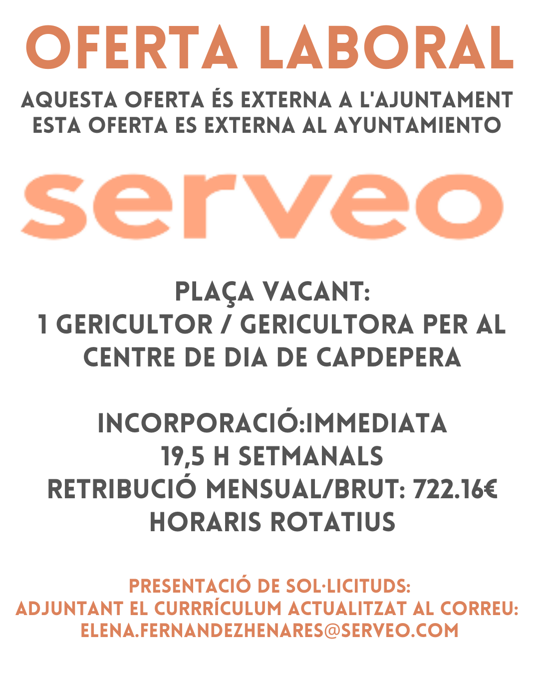 Per a més informació, enviar CV a: elena.fernandezhenares@serveo.com