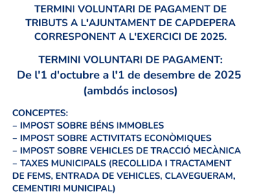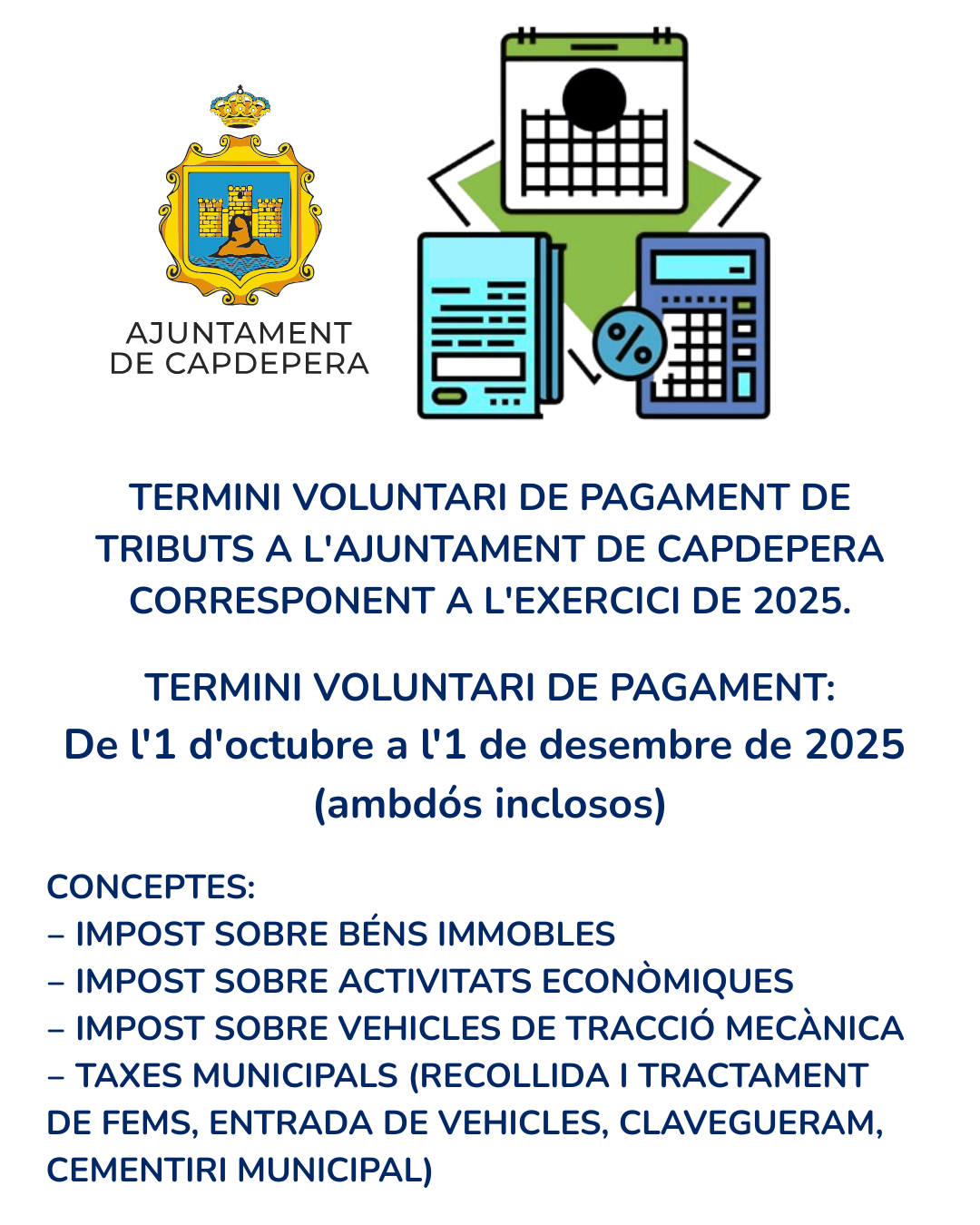 TERMINI VOLUNTARI DE PAGAMENT DE TRIBUTS A L'AJUNTAMENT DE CAPDEPERA CORRESPONENT A L'EXERCICI DE 2025