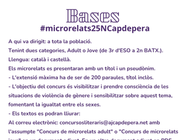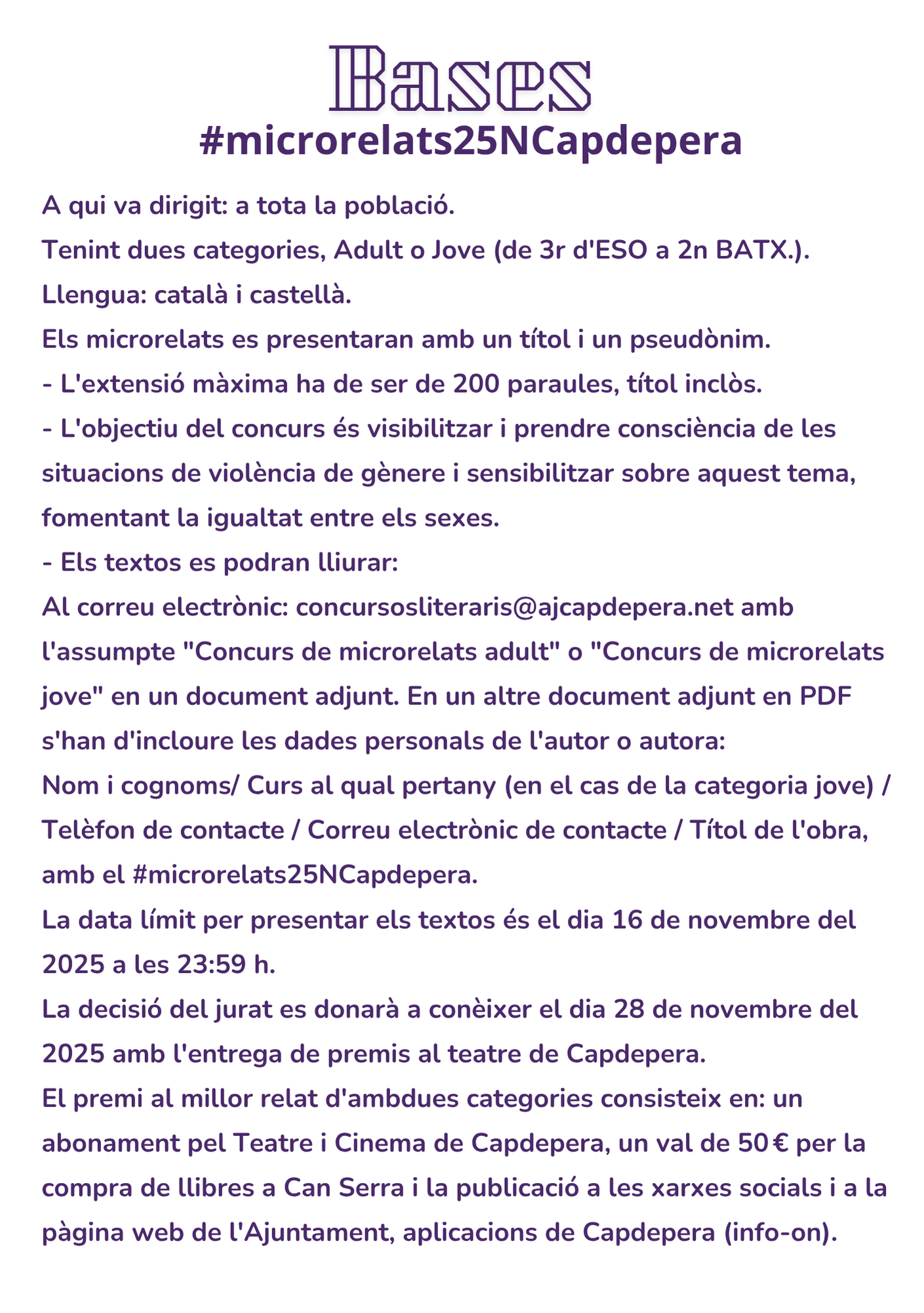 Nombre y apellidos / Curso al que pertenece (en el caso de la categoría joven) / Teléfono de contacto / Correo electrónico de contacto / Título de la obra, con el #microrelats25NCapdepera.
