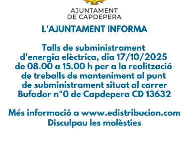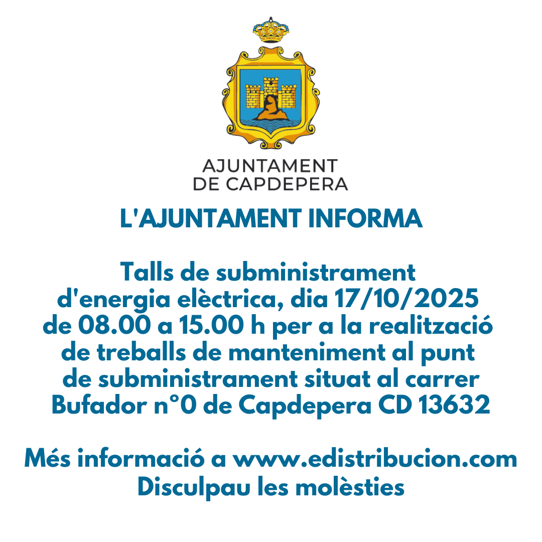 Cortes de suministro de energía eléctrica, día 17/10/2025 de 08.00 a 15.00 h para la realización de trabajos de mantenimiento en su punto de suministro situado en calle Bufador nº0 de Capdepera CD 13632.