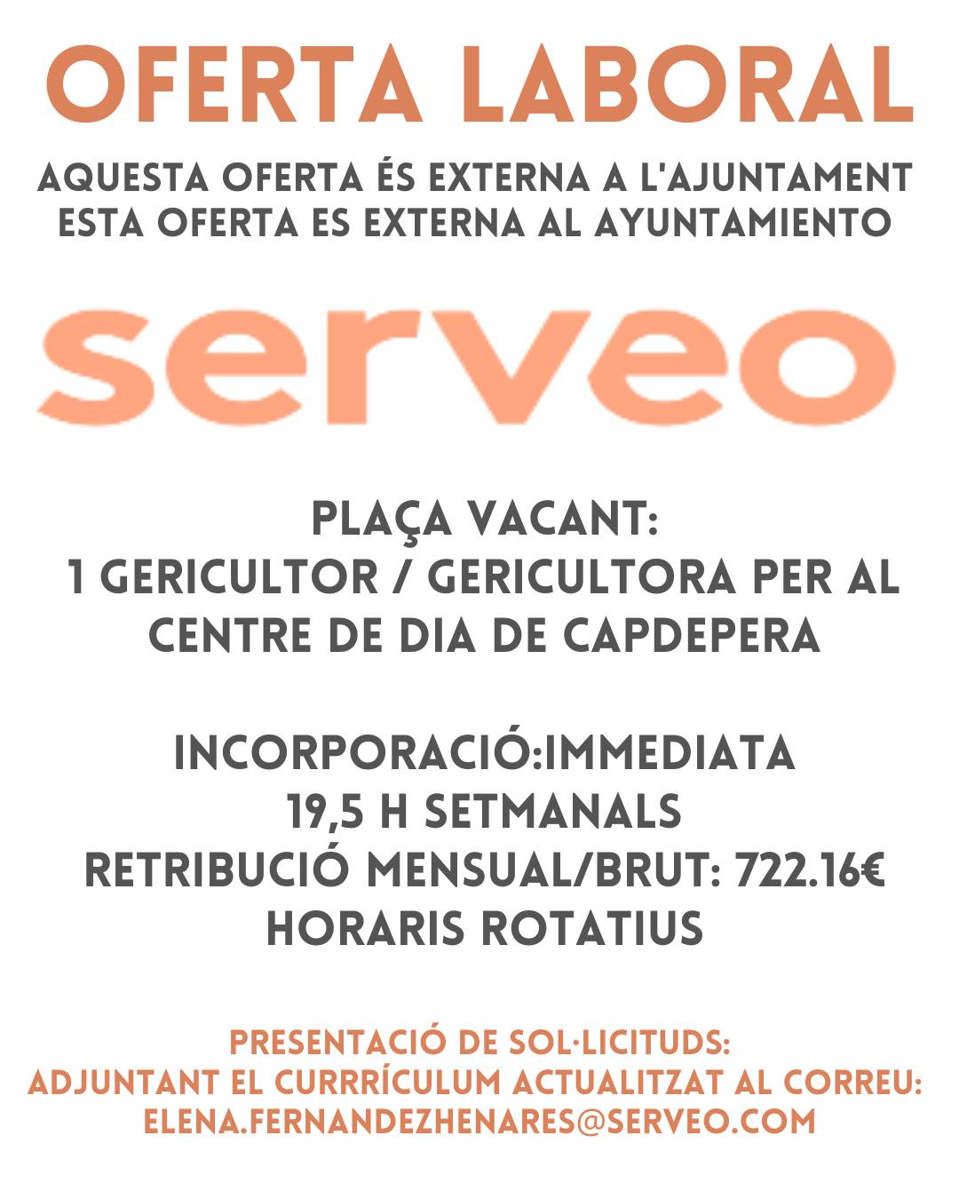 SERVEO selecciona 1 gericultor / gericultora para su Centro de Día de Capdepera en la calle Pizarro 84 de Cala Rajada.
